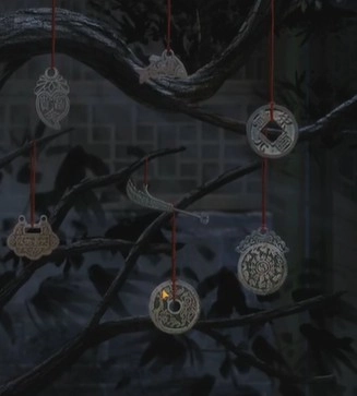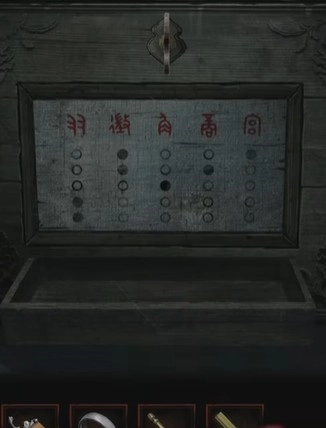21、回到庭院,点击树上挂的钱币,调换成如图的顺序获得发条钥匙。