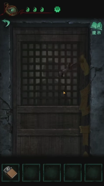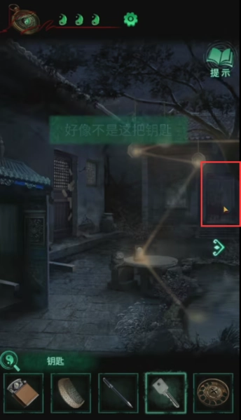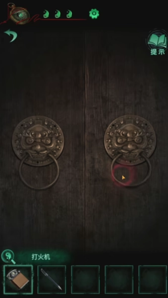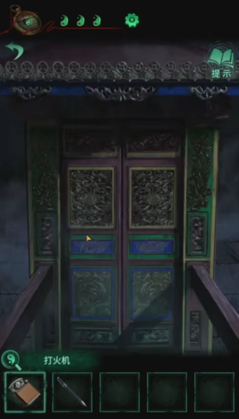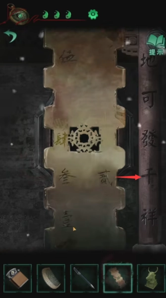 32、抵达大门处,拿出序号29所获取的物品,与门口对联的两处进行比对,从而发现线索。