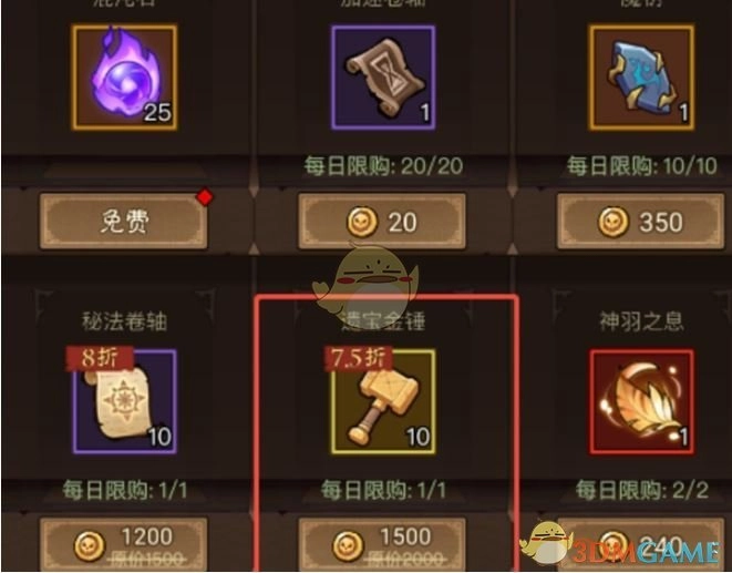 1、在游戏早期,可通过每日购买商店中的折扣金锤来积攒遗宝金锤。