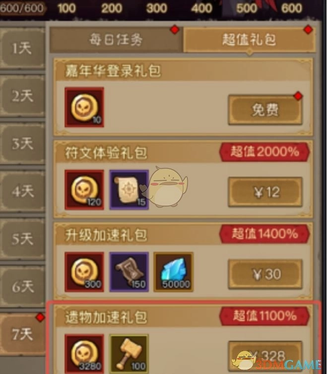 3、七日嘉年华第七天也会售卖遗物加速礼包,价值328,遗物奇遇活动期间可以购买。