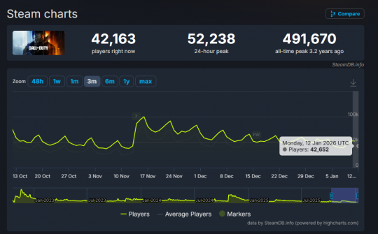 近日数据显示,尽管《战地风云6》在Steam平台的峰值同时在线玩家数已从超70万降至10万,但其表现依旧远超动视旗下的《使命召唤》系列。过去24小时里,Steam上《使命召唤》相关应用(涵盖《黑色行动7》《黑色行动6》《战区》以及多部《现代战争》系列作品等)的...