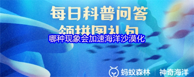 2025年6月26日,支付宝蚂蚁森林神奇海洋的问题已更新。今日题目为:哪种现象会加速“海洋沙漠化”?正确答案是:【气候变暖】。全球气候变暖是致使海洋沙漠化范围扩大的主要因素之一。 >>>>《支付宝》2025年最新蚂蚁庄园今日课堂答题大全 >>>>《支...