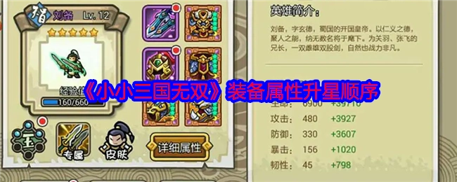 在小小三国无双里,装备该如何升星呢?小小三国无双是一款以小小三国为主题,采用手机卡牌玩法的策略战争手游。在这款游戏中,装备升星的推荐顺序为武器>战甲>头盔>护手>鞋子>腿甲。下面为大家带来《小小三国无双》装备属性升星顺序的分享,感兴趣的玩家不妨了解一下! ...