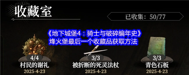 在《地下城堡4》里,存在着诸多可供收藏的物品,这些物品会陈列展示于主城审判庭内的收藏室之中。倘若能集齐特定套装,还可获取丰厚奖励。接下来,为大家带来由小编整理的《地下城堡4:骑士与破碎编年史》烽火堡最后一个收藏品的获取方法,感兴趣的小伙伴不妨一同来瞧瞧。 ...