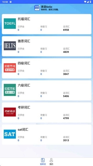 2、完成登录操作后,系统会呈现托福、雅思等不同阶段的词汇资料,你可以结合自身的学习进度来进行单词记忆。