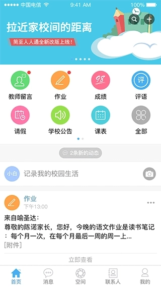 简至人人通是一款出色的家校共育平台,能有效缩短学校与家庭之间的距离。家长通过平台可以便捷地获取需联系的教师或其他家长的信息,学校通知、教师布置的作业清晰可见,还能了解孩子的课堂表现、教师点评及考试成绩,从而及时分析并协助孩子解决问题,助力孩子愉快学习、茁壮成长。教师方面,能够实时查看学生作业完成进度,统计学习时长等数据,便于顺利开展教学工作。