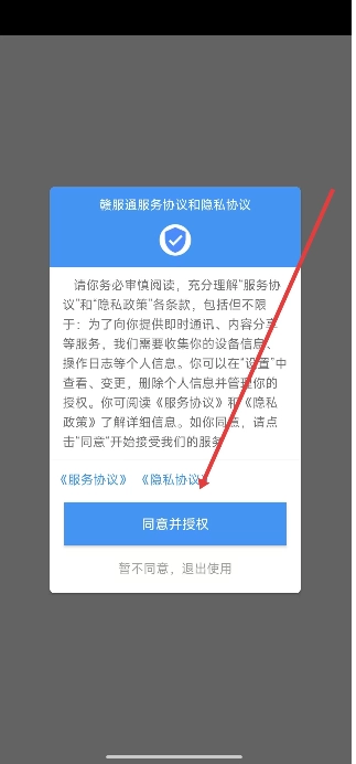 打开赣服通App后,点击弹窗里的同意按钮,即可进入应用开始使用。
