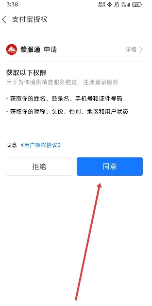 进入支付宝授权页面后,点击同意按钮以完成授权登录操作。