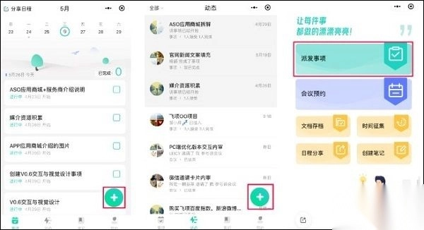 在事项页面、动态页面分别点击对应的“+”按钮,或是通过快捷功能中的“派发事项”入口,都能进入到创建事项的界面。
