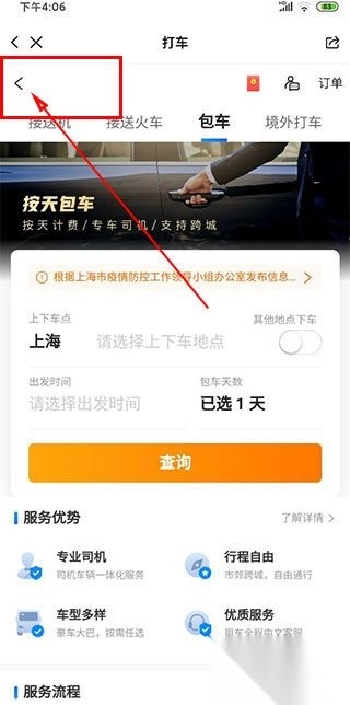 完成页面跳转操作后,点击“后退”按钮,接着选择“租车自驾”选项。