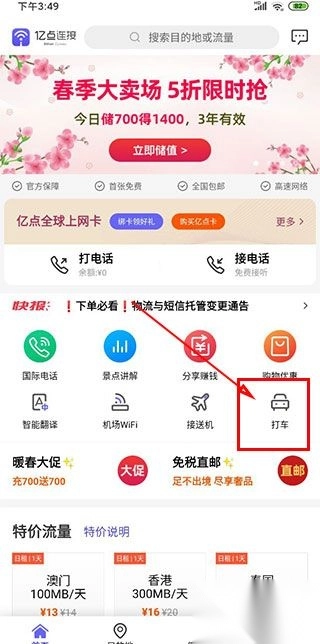 请您打开亿点连接万能WiFi钥匙,接着点击打车选项。