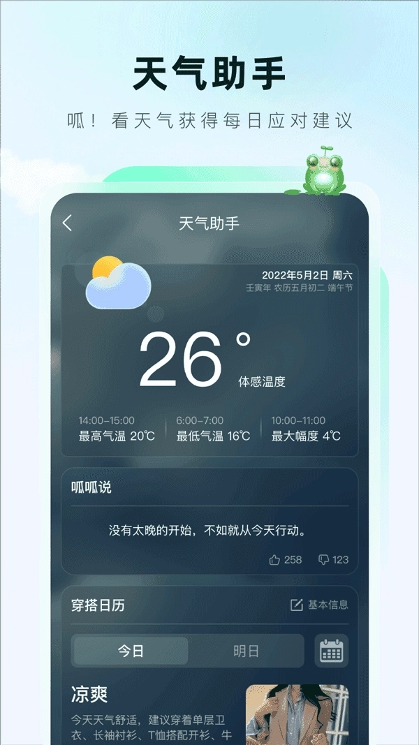 天气穿搭笔记:依据每日的天气状况,记录个人的服装搭配,创建专属的私密天气穿搭档案。