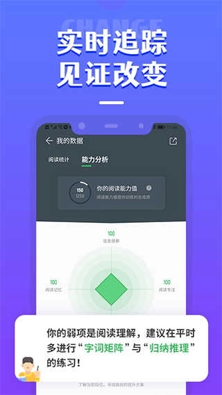 4、训练数据实时追踪:每一次细微的变化都意味着显著的成长,我们将为你记录每日的投入与蜕变,通过多维度专业数据的对比分析,助力你清晰洞察自身的优势与不足,从而精准强化阅读能力,高效实现既定目标。