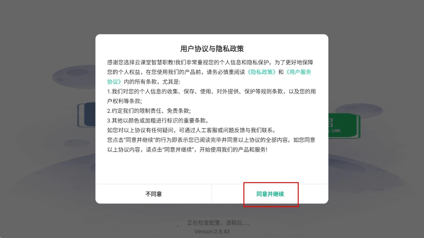 1、阅读【用户协议与隐私政策-弹窗内容】后,点击【同意并继续-按钮】,进入下一步。