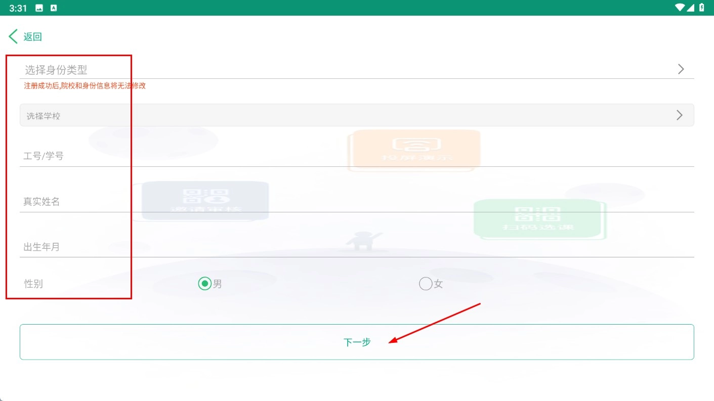 3、完成登录后,进入信息填写页,选择【身份类型-选项】并补充相关信息。