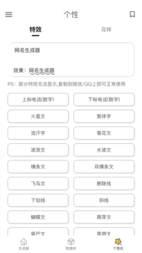 3、自动生成各类网名特效,一键复制使用,安全快捷,还有字体特效工具辅助。