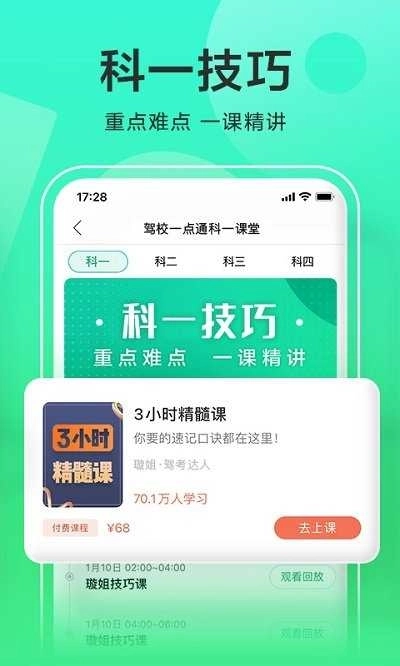驾校一点通是一款专为学车人群打造的移动应用,它整合了丰富的学车资源与实用工具,助力用户更高效地学习驾驶技能,熟悉各类考试形式,从而提升应试信心。该应用还提供科目一至科目四的详尽学习资料,涵盖各科目考试内容及相关注意要点。