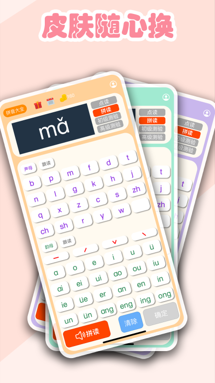 3. 听读模式:该模式下会播放拼音读音,您可跟着模仿,从而学习到正确发音。