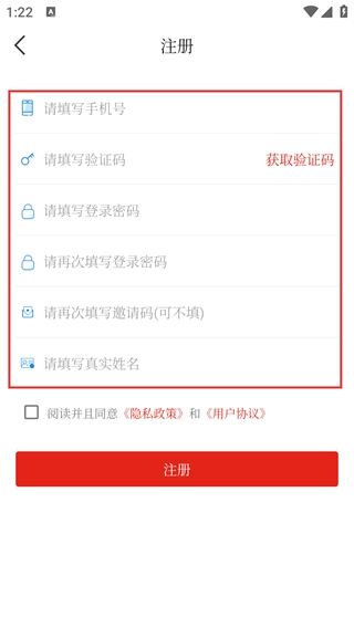 4、在注册页面,依次填写【请填写手机号】-【请填写验证码】等信息,点击【注册】完成账号注册操作。