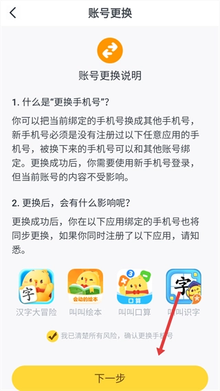 2、勾选“我已清楚所有风险,确认更换手机号”选项,点击“下一步”继续操作。