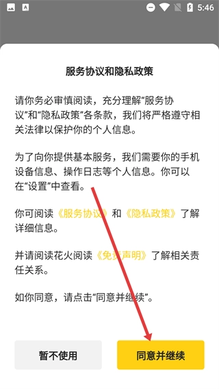 1、打开应用后会弹出【服务协议和隐私政策】的提示,阅读完毕后点击【同意并继续】即可进入应用。