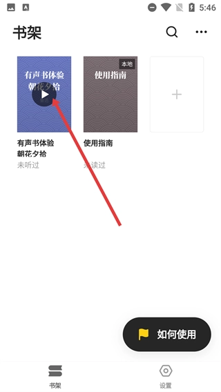 3、进入【书架】页面后,能看到【有声书体验-朝花夕拾】之类的资源,点击相应有声书的封面,即可进入播放界面。
