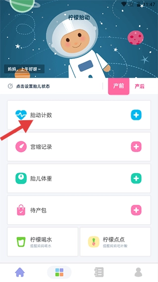 1、启动柠檬胎动应用,点击界面上的【胎动计数】选项,即可进入胎动计数功能页面。