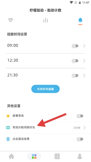 2、进入胎动计数页面后,点击右上角的设置图标,即可进入设置界面。