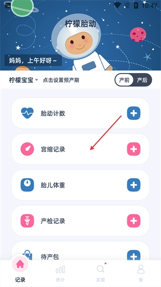 1、在【记录】页面,找到“宫缩记录”选项并点击。