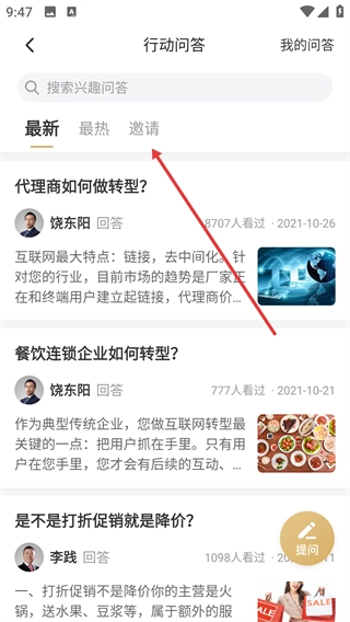 2、在行动问答页面点击【邀请】标签,切换至邀请类问答列表。