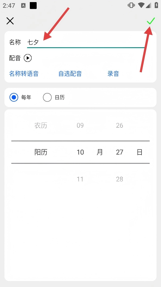 4、添加节日时,输入【名称-七夕】,选择每年或日历模式,设置日期后点击右上角【√】确认,完成节日添加。