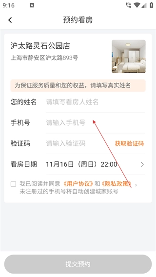 4、进入预约页面后,依次填写姓名与手机号,获取并输入验证码,选定看房日期,随后勾选相关协议并点击【提交预约】按钮,即可完成看房预约流程。
