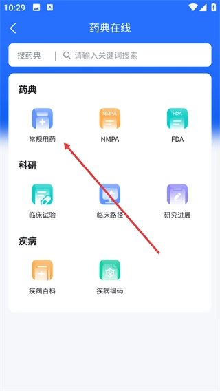 2、在药典在线页面点击【常规用药】选项,进入常规用药页面。