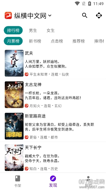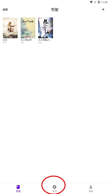 1、打开知书应用,进入书架页面后,点击底部导航栏中的“发现”选项,即可切换至发现界面。