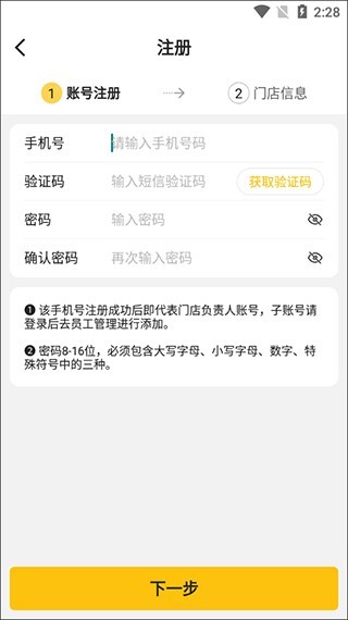 2、此过程分为两个步骤,分别是账号注册与门店信息填写,用户依照提示填入对应内容就行。