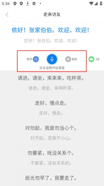 我们为每种方言都设计了常用的对话场景,你既可以连贯收听整段对话,也能录制自己的发音并融入对话编排里,实现原音与你的录音混合播放,从而沉浸式感受情景方言。