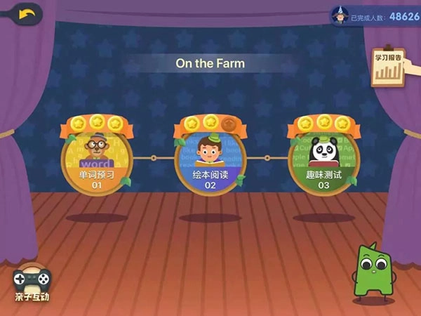 单独打开一本绘本后,会有2-3个环节,依次是单词预习、绘本阅读以及趣味测试。