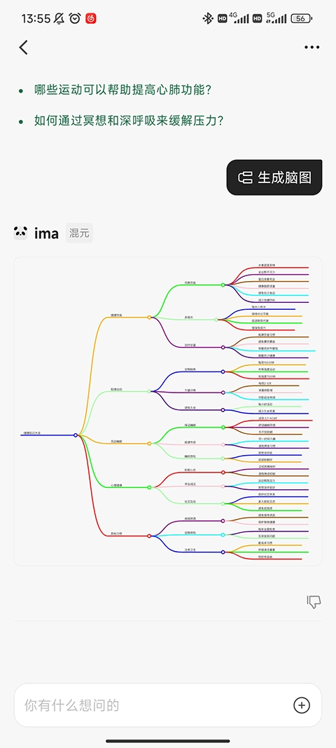 你可以通过两种方式生成脑图:一是在对话界面底部的功能区域找到并点击“生成脑图”按钮,二是直接在输入框内输入“生成脑图”并发送,系统都会依据当前的对话内容为你创建对应的脑图。