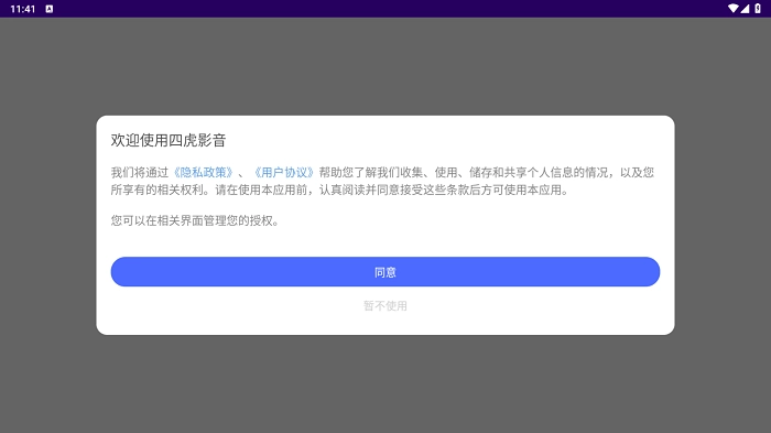 欢迎使用四虎影音:我们会借助《隐私政策》与《用户协议》,让您清楚我们对个人信息进行收集、使用、储存和共享的具体情况,同时也让您了解自己所拥有的相关权利。请您在使用本应用之前,仔细阅读这些条款并同意接受,之后才能使用本应用。您能够在相关界面中管理自己的授权。请点击同意按钮。