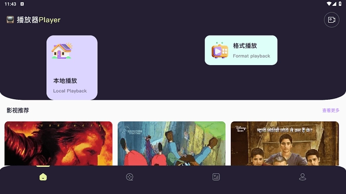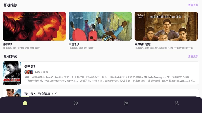 首页设有影视推荐板块,您可点击右侧的紫色“查看更多”按钮,以获取更多相关内容。