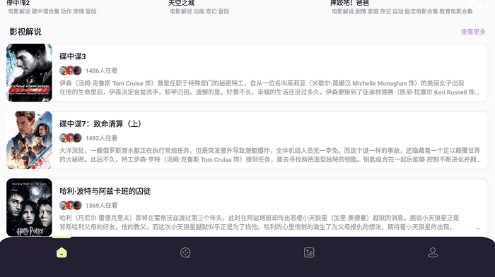 您可以向下滑动屏幕浏览影视解说内容,也能点击右侧的紫色“查看更多”按钮获取更丰富的信息。