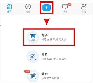 首先打开正版米游社,接着点击底部的“加号”按钮,在弹出的三个选项里,选择最上方的“帖子”选项。