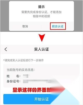 在点击“上传相册视频”后,会弹出一个窗口,此时点击“前去认证”将打开新界面。关键在于:若该界面与下方图示一致,则无法修改;若不一致,直接输入需更改的实名信息并点击确定即可。