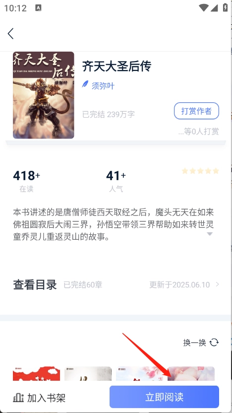 用户找到想看的小说并进入详情页面后,点击“立即阅读”按钮即可开始阅读。