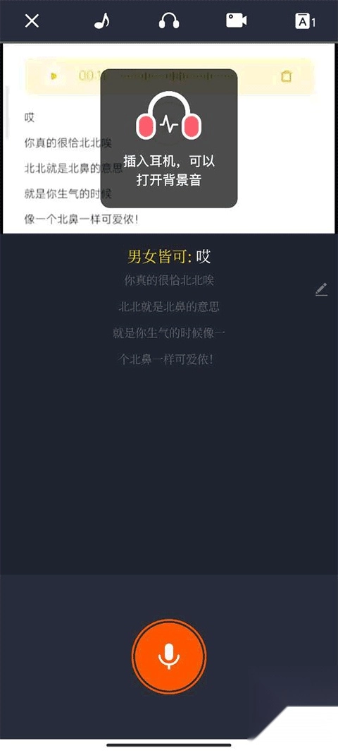 2、进入之后,带上耳机,点击下方的麦克风按键进行录音,完成录音后可以点击又上方的勾进行保存。