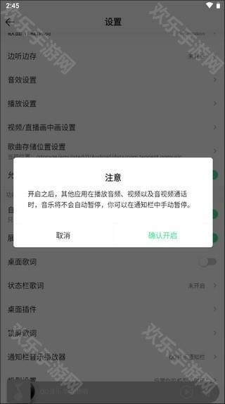 4、开启“允许与其他应用同时播放”的开关后,QQ音乐的播放就不会再被中断了,哪怕你正在进行微信电话或钉钉视频通话,也能继续播放歌曲。