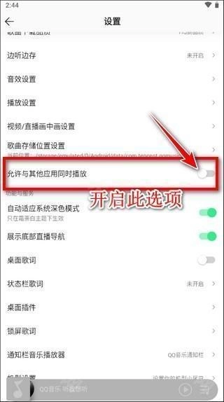 3、向下滑动页面,在之前的存储位置附近,能找到“允许与其他应用同时播放”的开关,打开它就可以了。