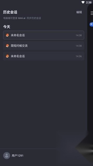 4、点击左上角的三条横线图标,即可打开菜单界面,在其中可以查看历史对话记录,还能进行账号切换等操作。
