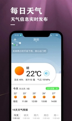 4,天气预报功能:可提供未来15天的精准天气预测,助您提前掌握出行、旅游、逛街、约会、运动等各类场景的天气状况。