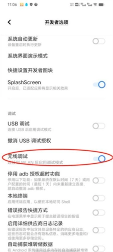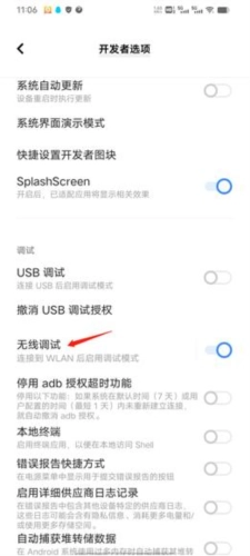 三、开启“开发者选项”里的“无线调试”功能:首先进入系统管理界面,接着向下滑动页面至底部,然后进入开发者选项,最后打开无线调试的开关。